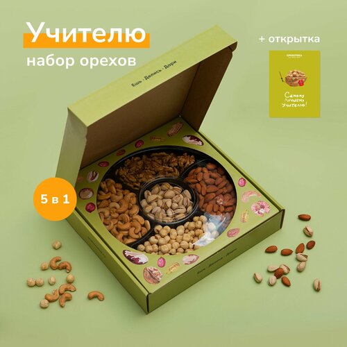В состав подарочного набора входят 5 вкусных и свежих орехов: крупный жареный миндаль, кешью жареный, фисташки "Калифорния" жареные солёные, фисташки обжаренные слабосолёные с добавлением шафрана, макадамия в скорлупе. Орехи - отличная идея подарка для любого праздника, для этого в нашем ассортименте есть классический подарочный набор, а также боксы с универсальными открытками, например: "Спасибо", "Пусть мечты сбываются" и "Я люблю тебя". Если же, вы хотите попасть точно в цель, то выбирайте набор с тематической открыткой практически для любого события и повода, это может быть день рождения, 8 марта, 14 февраля, день защитника отечества, новый год, 1 сентября, день учителя, рождество и другие праздники. Подарочная упаковка набора с уникальным авторским дизайном не оставит равнодушных, она смотрится очень презентабельно за счёт интересного оформления и своих габаритов. Коробка большая, её размер 26 см на 26 см, а вес вместе с упаковкой около 1 кг. Этот набор не покажется простым презентом "для галочки". Челов