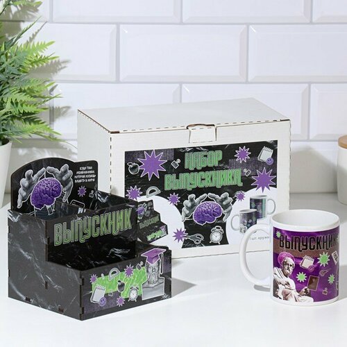 Подарочный набор "Выпускнику школы!" органайзер, кружка, черный цвет, фиолетовый цвет 9694421