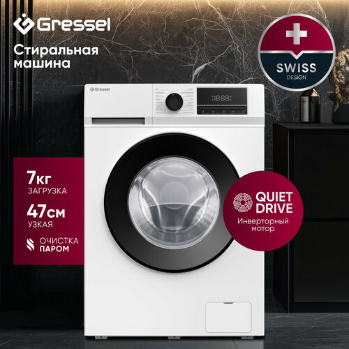 Стиральная машина Gressel UWC701 (7кг) с инверторным мотором и функцией пара, узкая, дозагрузка белья, 1200 оборотов