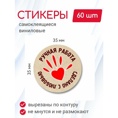 Наклейки "Ручная работа" виниловые самоклеящиеся, крафт, размер 3,5х3,5 см, 60 стикеров для hand made, творчества, крафтового производства