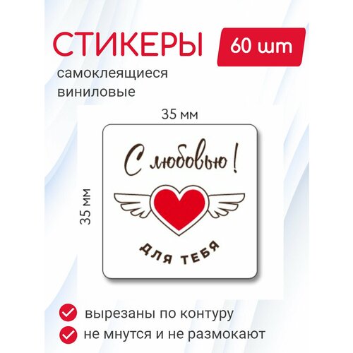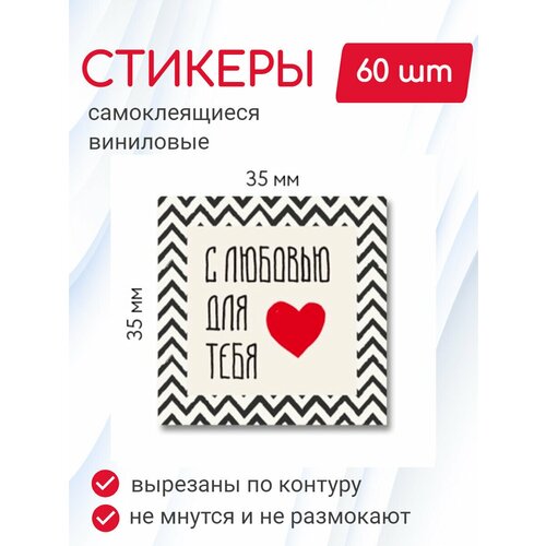 Наклейки виниловые "С любовью! Для тебя", 60 шт, 3,5х3,5 см. Самоклеящиеся стикеры, вырезанные по контуру для подарков, букетов, конвертов