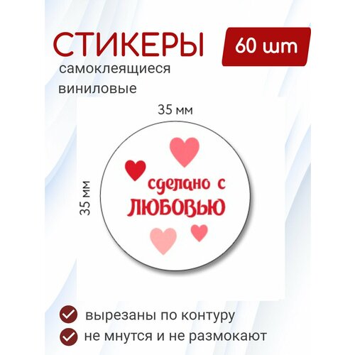 Наклейки виниловые самоклеящиеся 3,5х3,5 см, 60 шт "Сделано с любовью", круглые стикеры для хэнд мейд, упаковки, ручной работы