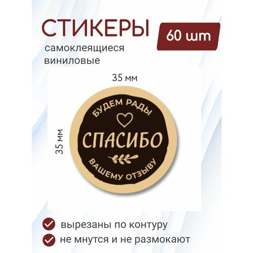 Наклейки виниловые 3,5х3,5 см, 60 шт из самоклеящейся пленки "Спасибо (за отзыв)",. Стикеры для упаковки заказов