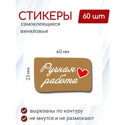 Наклейки "Ручная работа" виниловые 4х2,3 см, 60 шт. Самоклеящиеся этикетки бежевые, вырезанные по контуру, для упаковки handmade товаров
