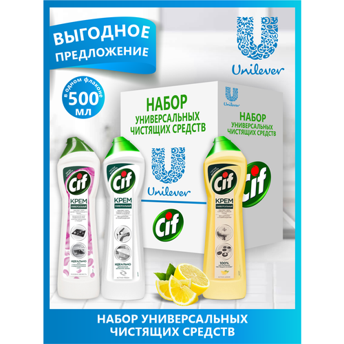 Набор CIF Чистящее средство Крем Актив лимон 500 мл.+Крем Актив Фреш 500 мл.+Розовая свежесть 500 мл