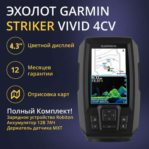 Эхолот Garmin Striker Vivid 4cv с трансдьюсером GT20+Акб 7Ач, ЗУ Robiton, Крепление датчика МХТ