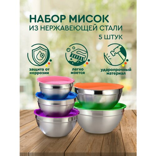 Набор мисок (5 штук, цветные крышки) Hans&Helma металлические из нержавеющей стали для еды хранение органайзер