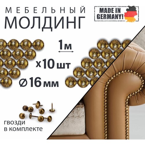 Комплект мебельных молдингов (10шт. по 1м + гвозди), d 16 мм, для перетяжки и декора, металлические, 160 1/3, старое золото