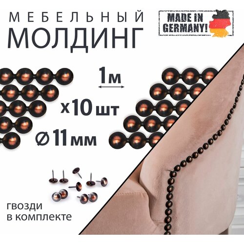 Комплект мебельных молдингов (10шт. по 1м + гвозди), d 11 мм, для перетяжки и декора, металлические, 130 1/3, старая медь