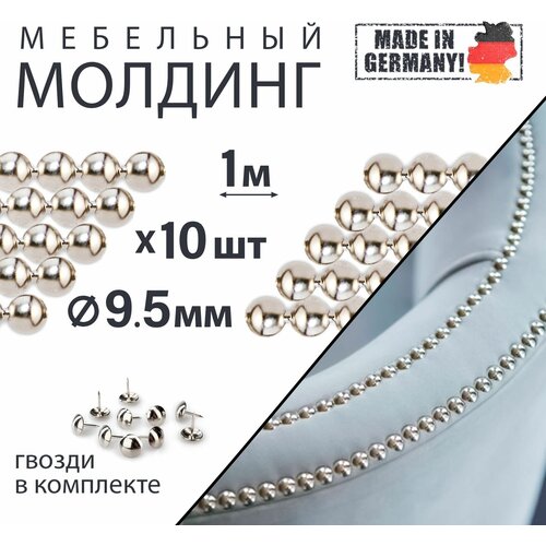 Комплект мебельных молдингов (10шт. по 1м + гвозди), d 9.5 мм, для перетяжки и декора, металлические, 100 1/3, никель