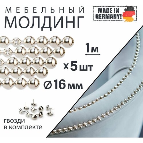 Комплект мебельных молдингов (5шт. по 1м + гвозди), d 16 мм, для перетяжки и декора, металлические, 160 1/3, никель
