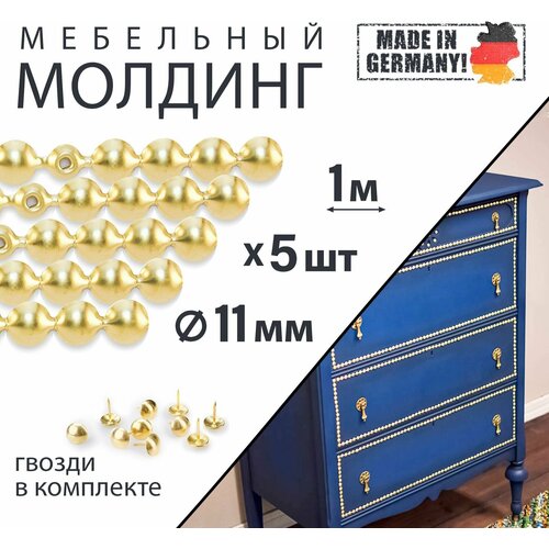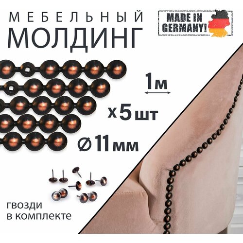 Комплект мебельных молдингов (5шт. по 1м + гвозди), d 11 мм, для перетяжки и декора, металлические, 130 1/3, старая медь