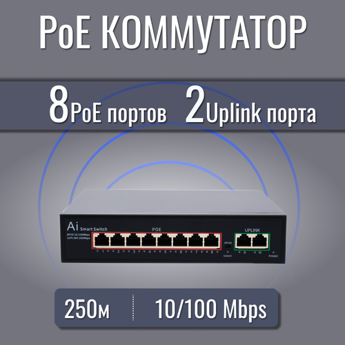 Коммутатор (свитч) PoE 8 портов +2 LAN для IP видеонаблюдения