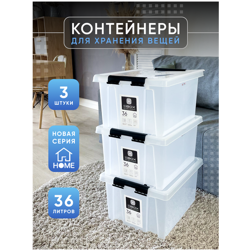 Контейнер пластиковый прозрачный с крышкой на защелках для хранения вещей, продуктов или игрушек, емкость 36л, набор 3 шт, SBOX