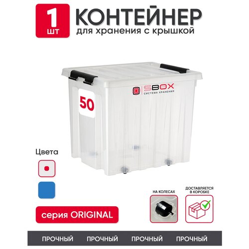 Контейнер пластиковый с крышкой на колесиках для хранения вещей, продуктов или игрушек, прозрачный 50л, SBOX