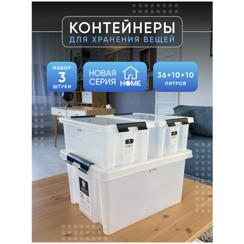 Контейнер пластиковый прозрачный с крышкой на защелках для хранения вещей, продуктов или игрушек, емкость 36л, 10л, 10л, набор 3 шт, SBOX