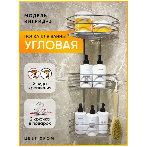 Полка металлическая для ванной угловая, нержавеющая, 3 яруса, Ингрид 3, хром