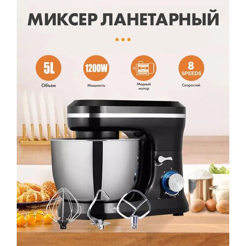 Миксер, планетарный миксер, миксер кухонный стационарный, 1200Вт, чаша 5 литра, 8 режимов скорости, откидной блок, насадка для теста, черный