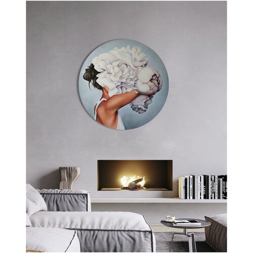 Круглая картина на хлопковом холсте "Девушка с пионами" от STUDIO A3 для интерьера / на стену / диаметр 50 см. (ECO - печать)