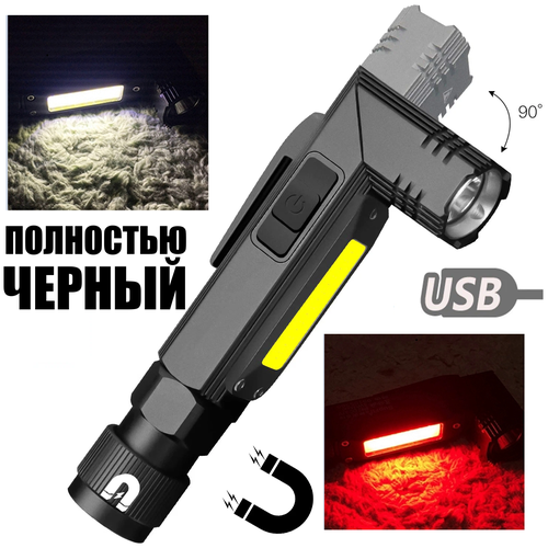 Фонарь поворотный светодиодный с мощным магнитом, 17 см, белый и красный свет, зарядка от USB, 5 режимов, полностью черный