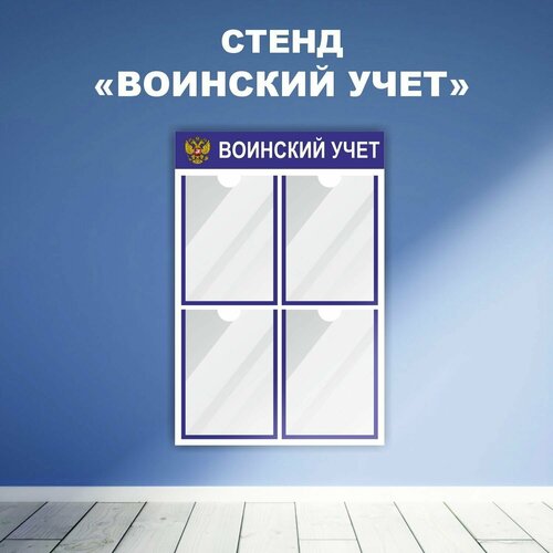 Стенд информационный "Воинский учет", 4 плоских кармана А4, цвет синий, 500х750 мм, VoloMar