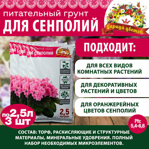 Комплект Почвогрунт Царица цветов для сенполий 2,5л , 3 штуки