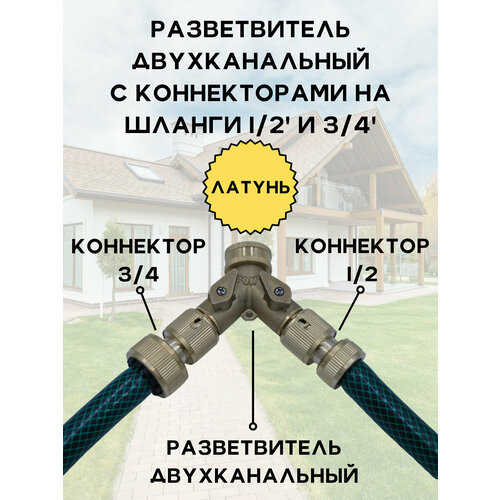 Разветвитель на кран двухканальный 1/2'-3/4' F латунь с латунными коннекторами на шланг садовый 1/2 и 3/4, система полива для сада и огорода