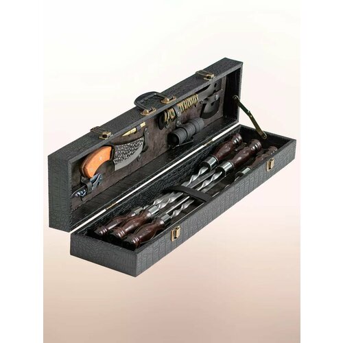 Набор для шашлыка подарочный в кейсе № 26 от GRILLS FACTORY. На 6 персон, с коричневым велюром внутри