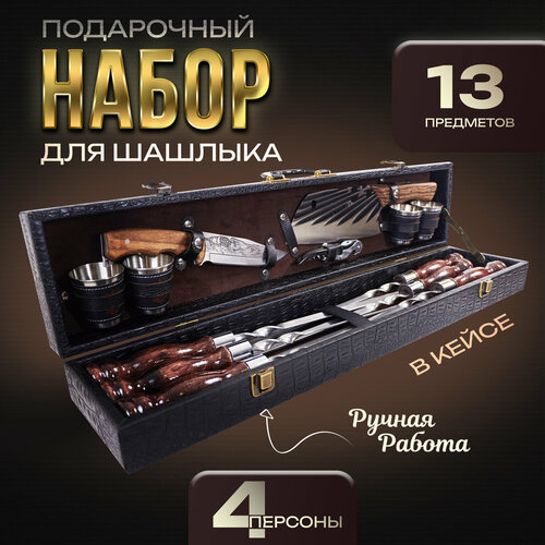 Набор для шашлыка подарочный в кейсе № 8 от GRILLS FACTORY. На 4 персоны, с коричневым велюром внутри