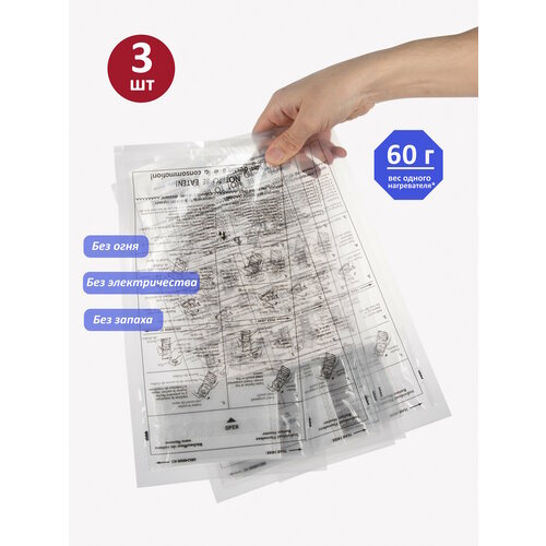 Размер пакета в рабочем состоянии 35 х 22 см. Вес одного разогревателя около 50 г.*Разогреватель состоит из внешнего пакета и помещенного в него нагревательного химического элемента.*Разогреватель активируется при добавлении 100 мл.воды(+/-10 мл)*Средняя температура «активированного» разогревателя 80 °C. Максимальная температура 95 °C.*В комплект входит 30 шт.*Использовать согласно инструкции на упаковке.*Произведено в России.