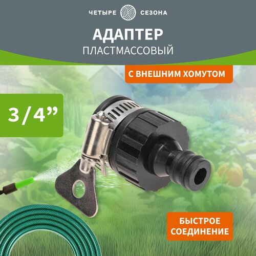 Адаптер для шланга штуцер пластмассовый, 3/4", с внешним хомутом четыре сезона