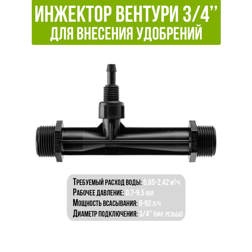 Инжектор Вентури для внесения удобрений 3/4" поток 0,65-2,42 м3/ч при 0,7-9,5 bar, мощность всасывания 9-92 л/ч