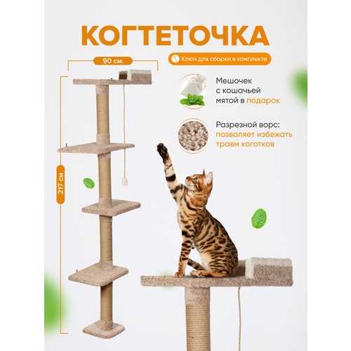 Высокая когтеточка-столбик с лежанкой для кошки угловая "Прыгун" капучино Кот Комфорт