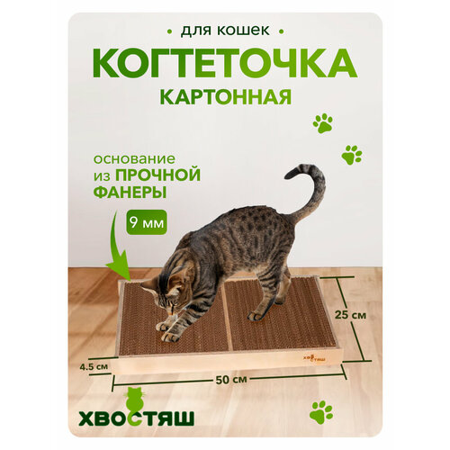 Картонная когтеточка ХВОСТЯШ двусторонняя с основанием из фанеры, 50х25 см