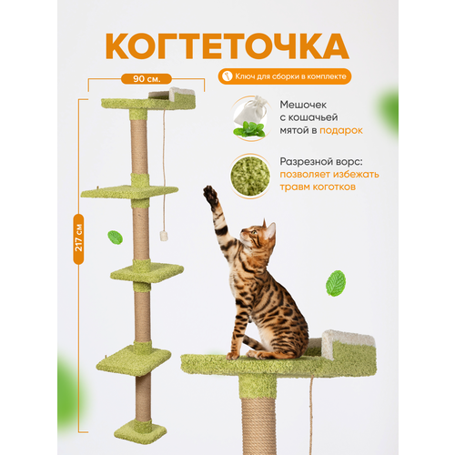 Высокая когтеточка-столбик с лежанкой для кошки угловая "Прыгун" зелёный Кот Комфорт