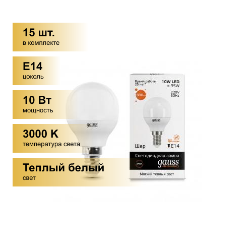 (15 шт.) Светодиодная лампочка Gauss Elementary Шар G45 E14 10W(710lm) 3000K 2K 86x45 матовая, пластик/алюм. 53110
