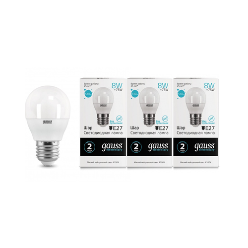 Упаковка светодиодных ламп 3 шт Gauss Elementary Шар 8W 540lm 4100K Е27 LED 53228