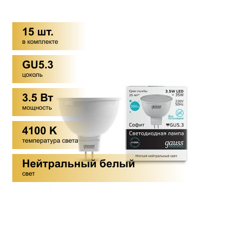 (15 шт.) Светодиодная лампочка Gauss Elementary MR16 GU5.3 220V 3.5W(300lm) 4100K 4K 50x45 матовая пластик/алюм.13524