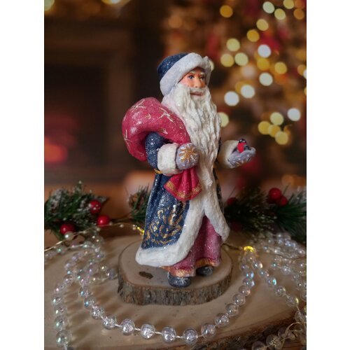 Ватная игрушка на елку "Дед Мороз со снегирем". Высота 13,5 см. Ручная работа