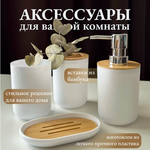 Набор аксессуаров для ванной комнаты с вставками из бамбука, белый, 4 предмета