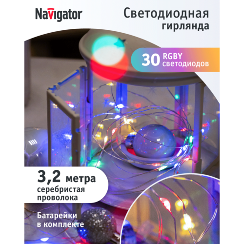 Гирлянда Navigator нить NGF-S01-50RGBY-5-3m-3AA-TR-IP20, 1 шт. в наборе, 3 х 3 х 0.01 м, 0.01 х 3 м, 50 ламп, разноцветный/прозрачный провoд