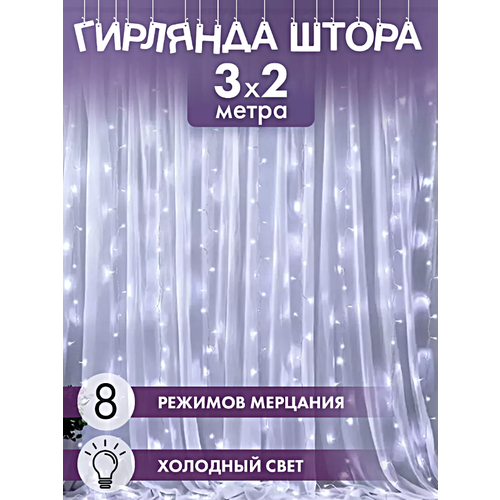 Гирлянда электрическая интерьерная 3х2 метра, Cветодиодная гирлянда штора на Новый год, Занавес, Электрогирлянда, Холодный