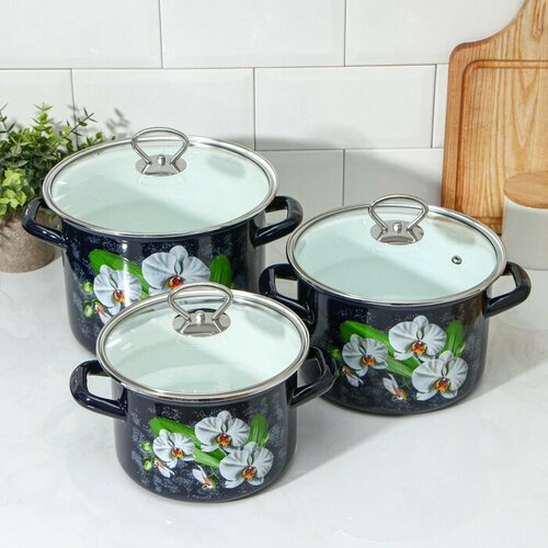 Набор кастрюль «Черный мрамор-1-ЭЛИТ», 3 предмета: 1,9 л, 2,5 л, 3,7 л, стеклянные крышки, индукция, цвет чёрный