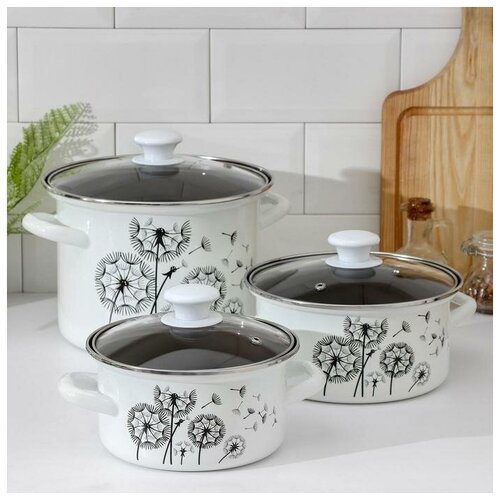 Набор кастрюль «Гортензия», 3 предмета: 2 л, 3 л, 4 л, стеклянные крышки, индукция, цвет белый