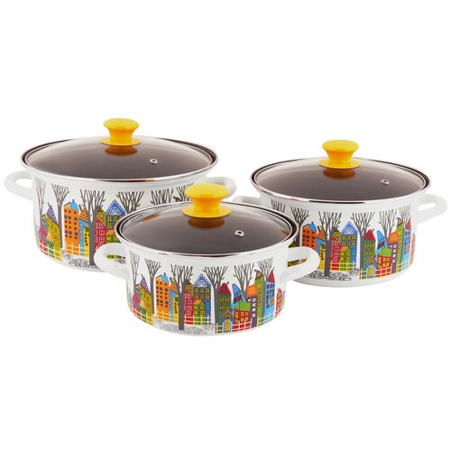 Керченская эмаль Набор кастрюль «Цветное печенье», 3 предмета: 1,5 л, 2 л, 3 л, стеклянные крышки
