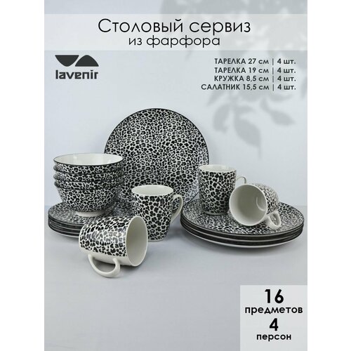 Фарфоровый столовый сервиз с кружками на 4 персоны, 16 предметов, леопардовый