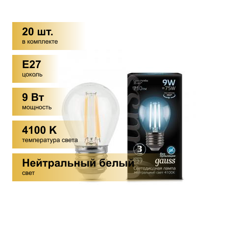 (20 шт.) Светодиодная лампочка Gauss Filament Шар G45 E27 9W(710lm) 4100K 4K прозр. 80x45 филамент (нитевидная) 105802209