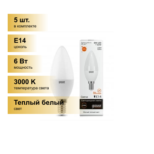 (5 шт.) Светодиодная лампочка Gauss Elementary Свеча E14 6W(420lm) 3000K 2K 100x37 матовая, пластик/алюм. 33116