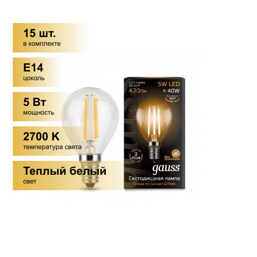 (15 шт.) Светодиодная лампочка Gauss Filament Шар G45 E14 5W(420lm) 2700K 2K 80x45 филамент (нитевидная), прозр. 105801105
