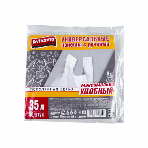 Универсальные пакеты с ручками Avikomp Popular, 11 мкм, 35 л, упаковка 30 шт, белые